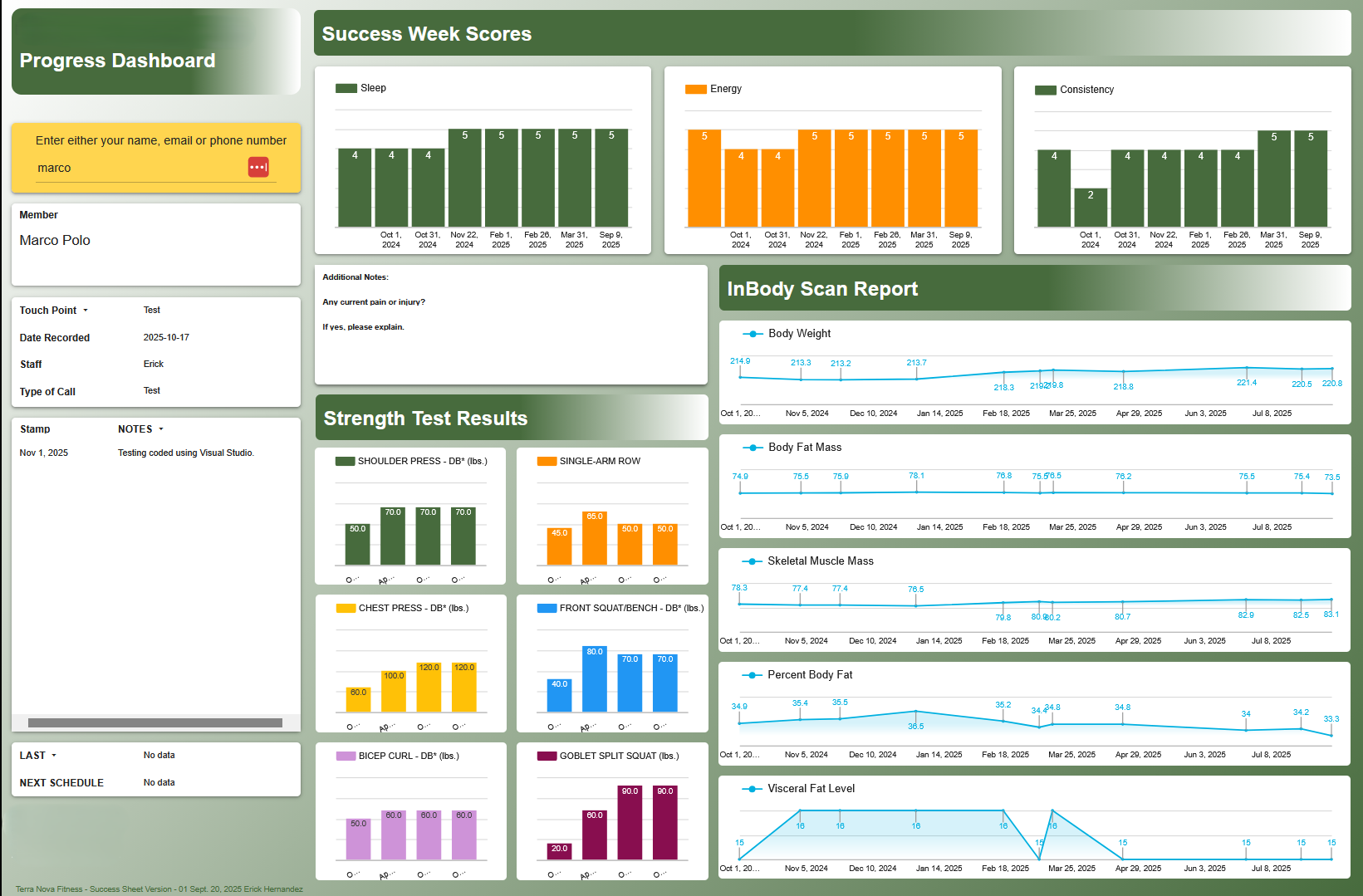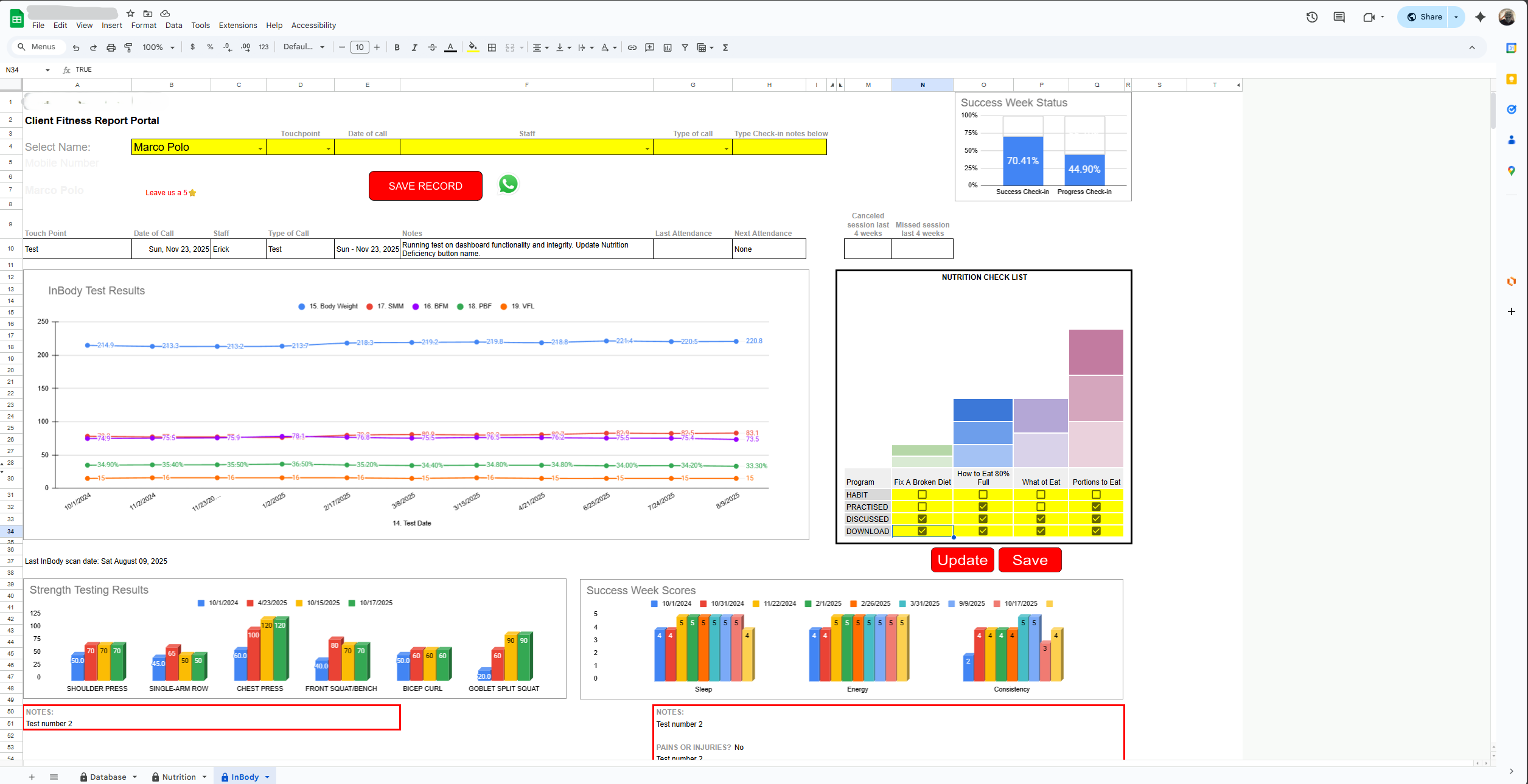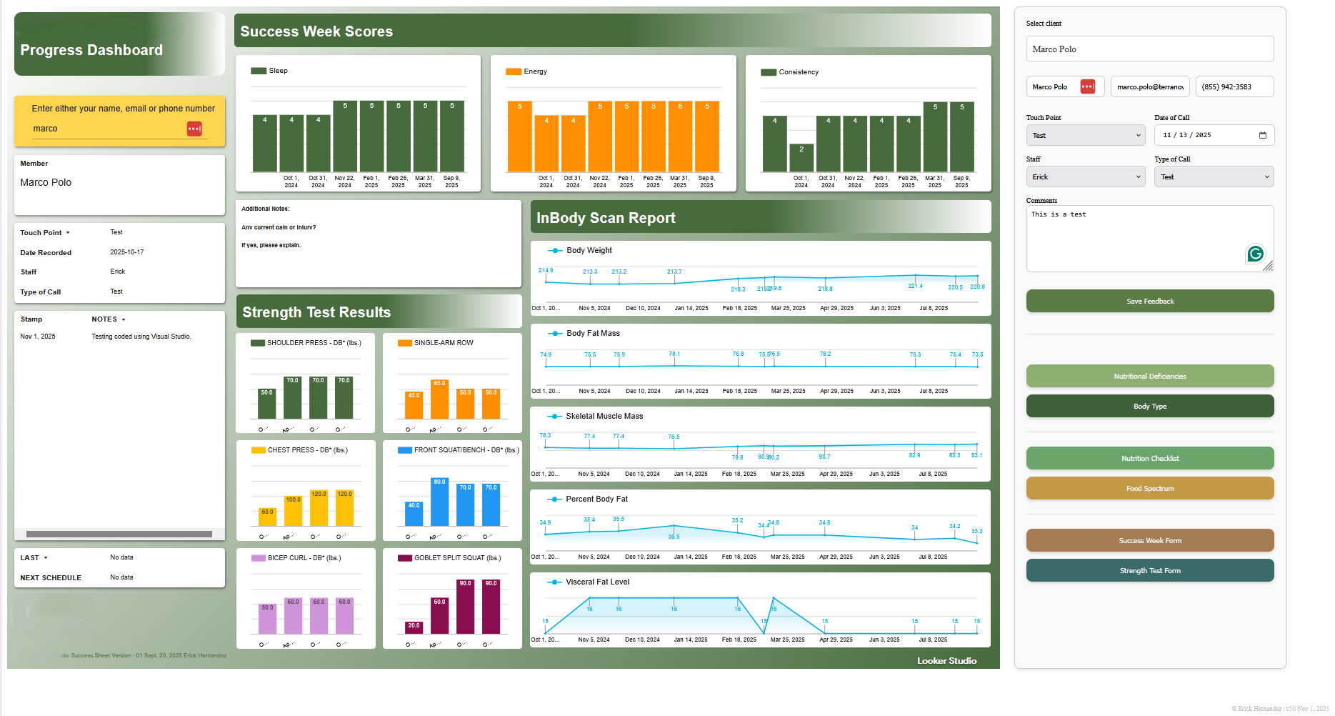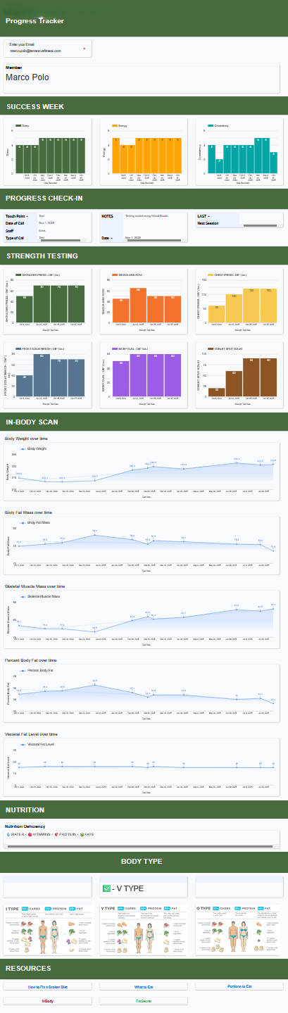 All-in-one portal for coaches to review member dashboards, record check-in notes, track progress, strength scores, nutrition data, and food spectrum data.